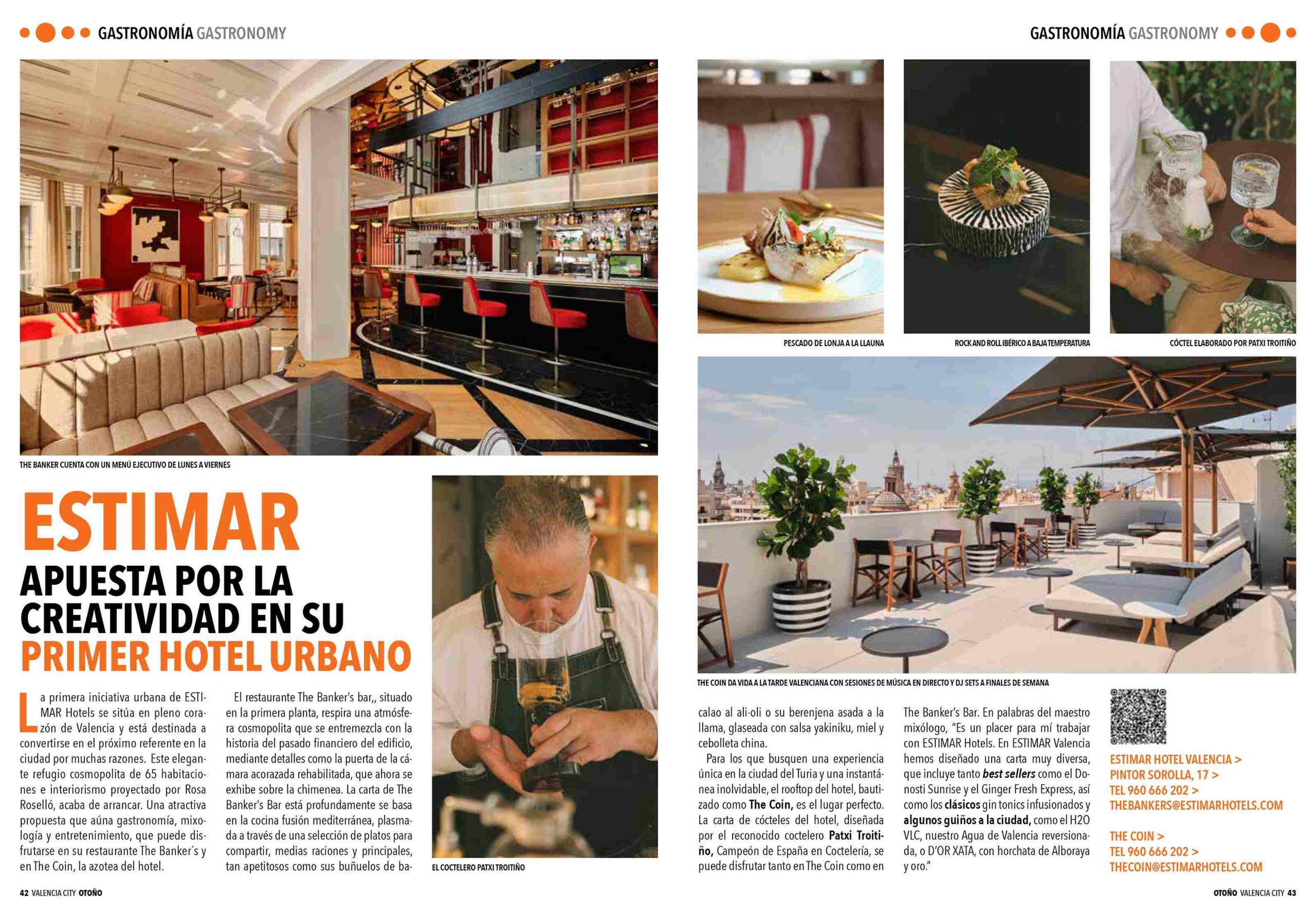 Estimar apuesta por la creatividad en su primer hotel urbano. Se trata de una atractiva propuesta que aúna gastronómica, mixología y entretenimiento. Este elegante refugio cosmopolita de 65 habitaciones e interiorismo proyectado por Rosa Roselló cuenta con un restaurante, The Banker’s, junto a su azotea, The Coin.