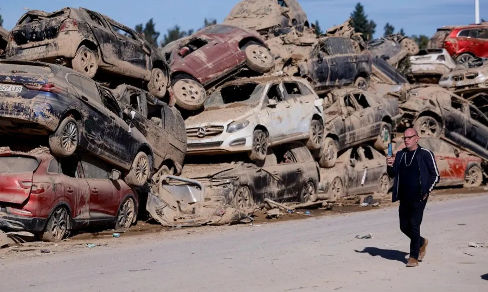 Un hom­bre pasa ante los innu­me­ra­bles coches api­la­dos en Cata­rro­ja. EFE/ Kai Förs­ter­ling