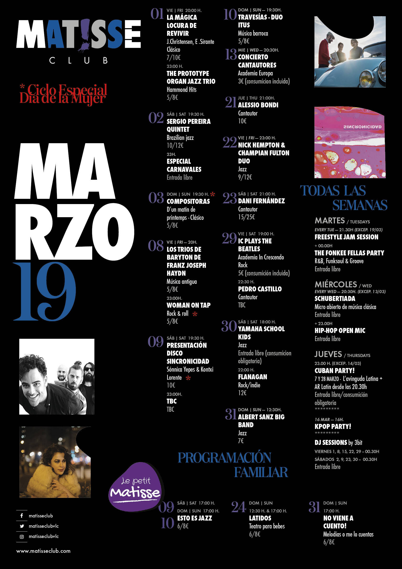 Los viernes y sábados de este mes estarán inundados de espectaculares eventos como la batucada especial carnaval, Sergio Pereira 5ET, The Prototype Organ Trio, Flanangan y muchos más. Y como cada último domingo de mes la Albert San Big Band. El ciclo Le Petit Matisse dedicado a los más peques y sus familias con Esto es jazz, Latidos y No viene a cuento.