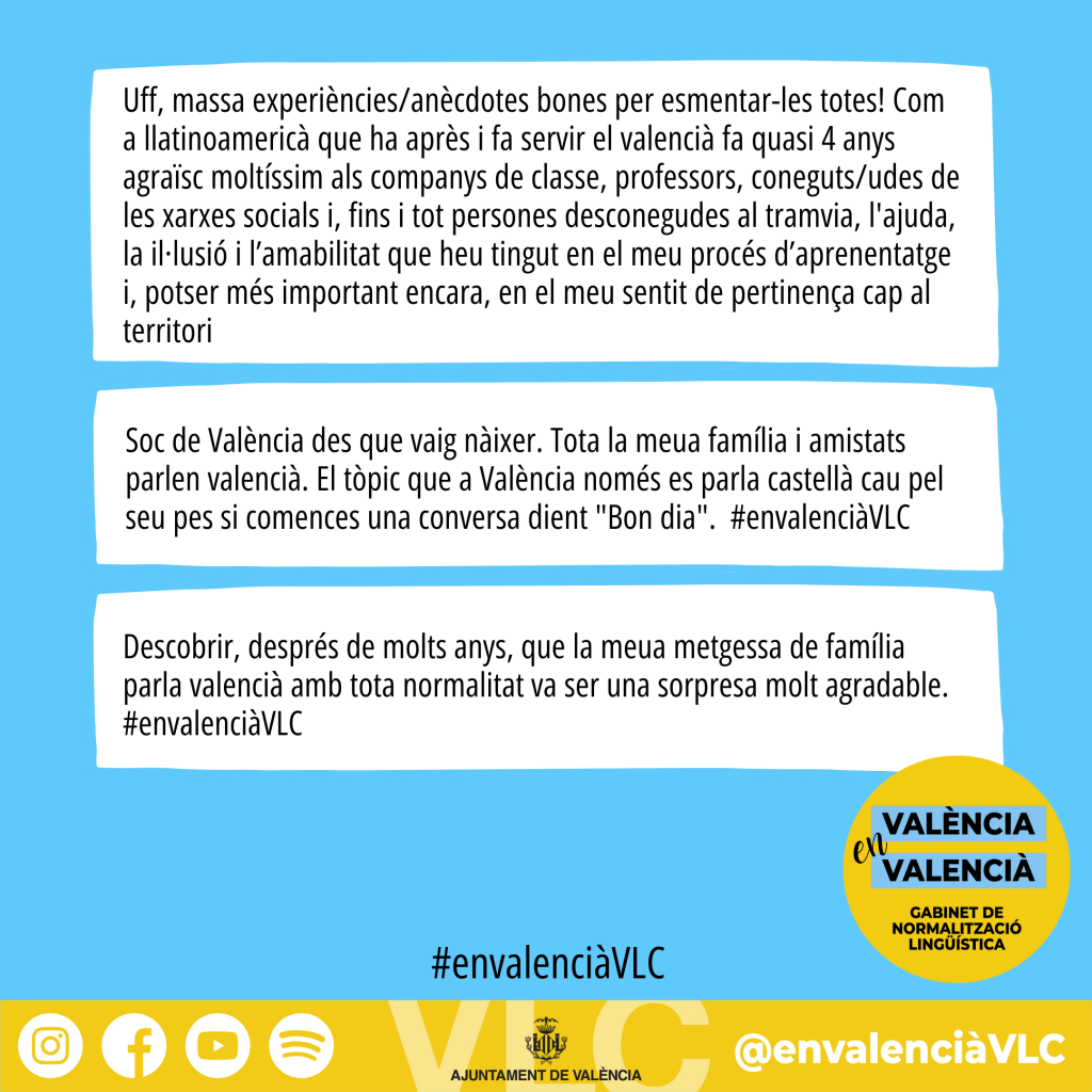 La campanya, a la que es van sumar persones conegudes de l’àmbit de la televisió i la cultura valenciana, així com moltes persones creadores de continguts per a xarxes, vindrà seguida de més iniciatives del Gabinet de Normalització Lingüística perquè es continue utilitzant el valencià en València. “Ara continuarà la fase d’implantació amb nous continguts, que també estan tenint una molt bona rebuda per part de la ciutadania”, ha explicat Notario.