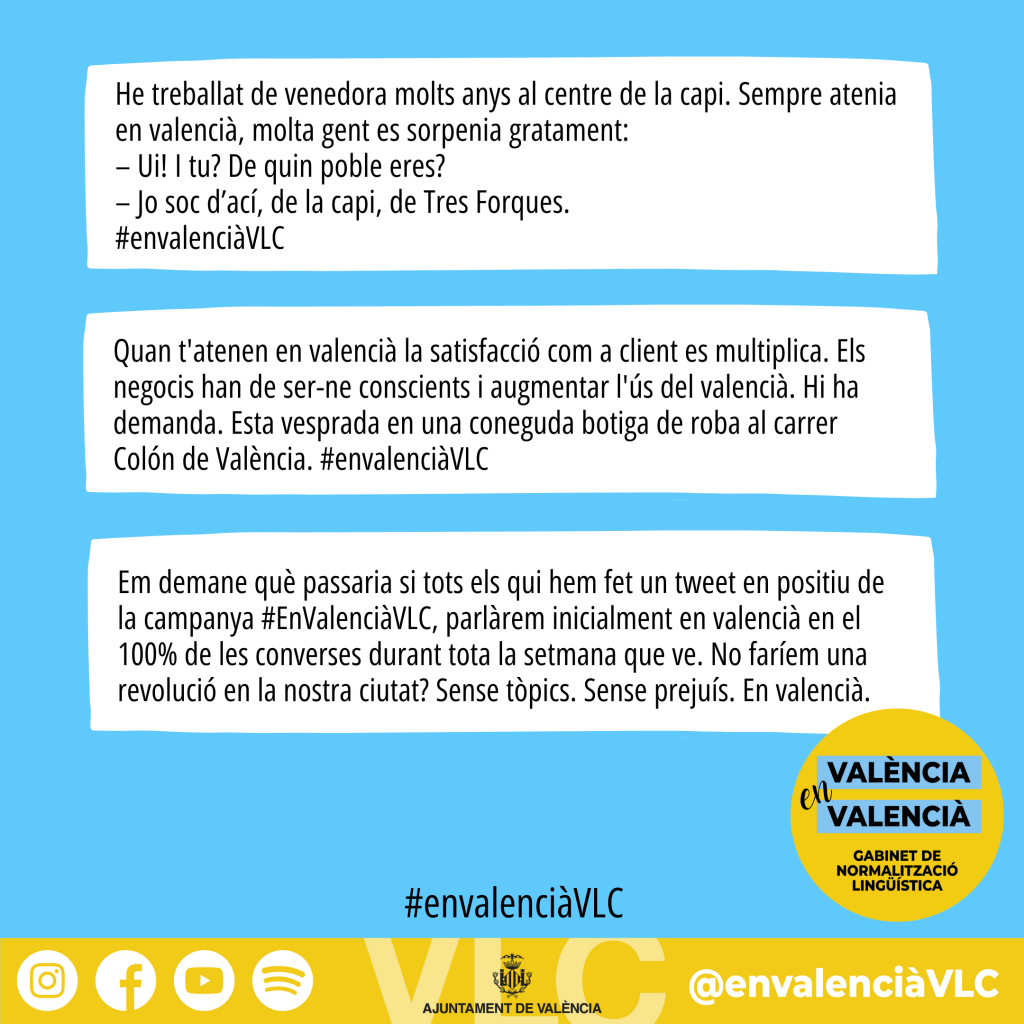 “A València es parla valencià. Volíem demostrar-ho i ho hem demostrat amb esta campanya. La recuperació d’espais d’ús per al valencià, per tal de fer-lo present en tots els àmbits de la vida ciutadana és de gran importància i la contribució de totes i tots és fonamental per aconseguir-ho més enllà de les parets de l’Ajuntament”, ha afirmat.