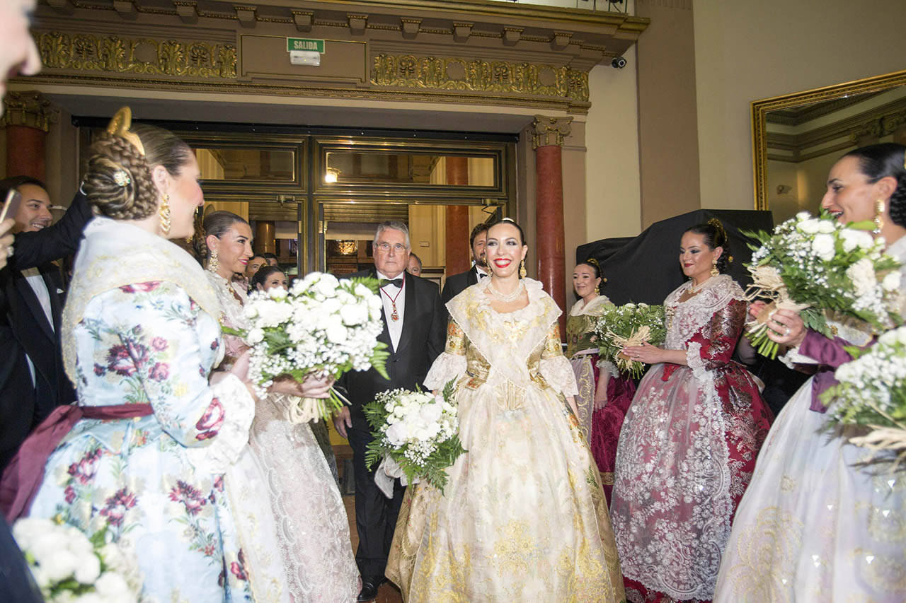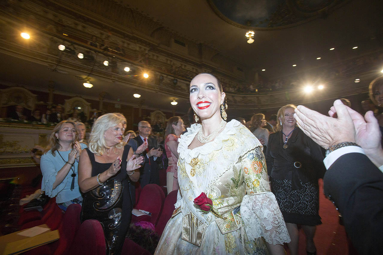 La regina de este año, Mónica Duart, recibió la Flor Natural en el emotivo acto de la entidad valencianista, que se vio obligada a cambiar, tras 140 años, el escenario del Teatro Principal, después de que la Diputación de Valencia se lo denegara definitivamente para este evento.
