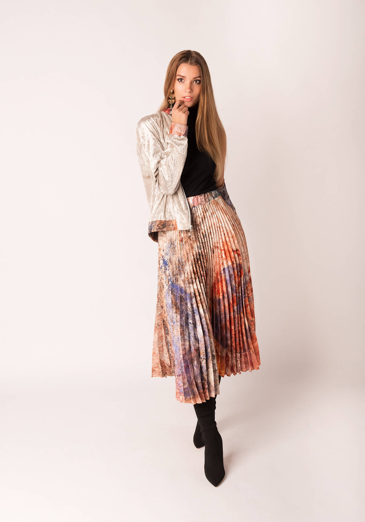 Inspiradas en su pintura, las prendas combinan terciopelo, seda y formas plisadas. El artista ha vuelto a reeditar sus telas, esta vez con diseños nuevos como las chaquetas reversibles.
