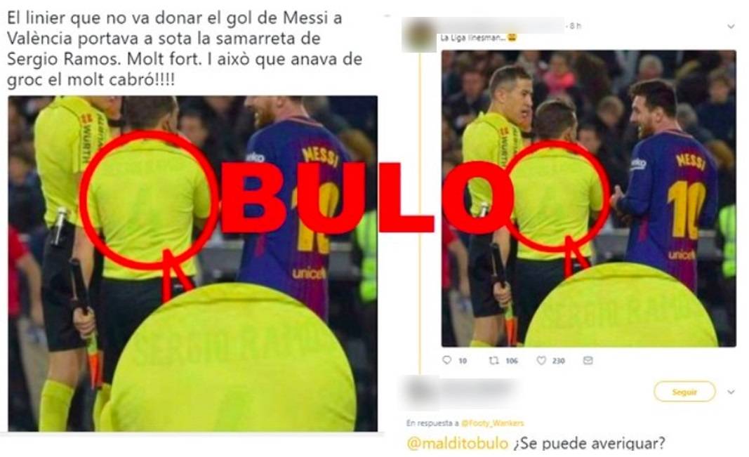 Coin­ci­dien­do con el final de la tem­po­ra­da 2019/2020 de La Liga, ha vuel­to a cir­cu­lar la ima­gen de un asis­ten­te arbi­tral vis­tien­do supues­ta­men­te la cami­se­ta de Ser­gio Ramos duran­te el par­ti­do entre el Valen­cia CF y el FC Bar­ce­lo­na del 26 de noviem­bre de 2017. Como ya os con­ta­mos, se tra­ta de un bulo pues­to que en la ima­gen ori­gi­nal se ve que no lle­va la cami­se­ta del madri­dis­ta.