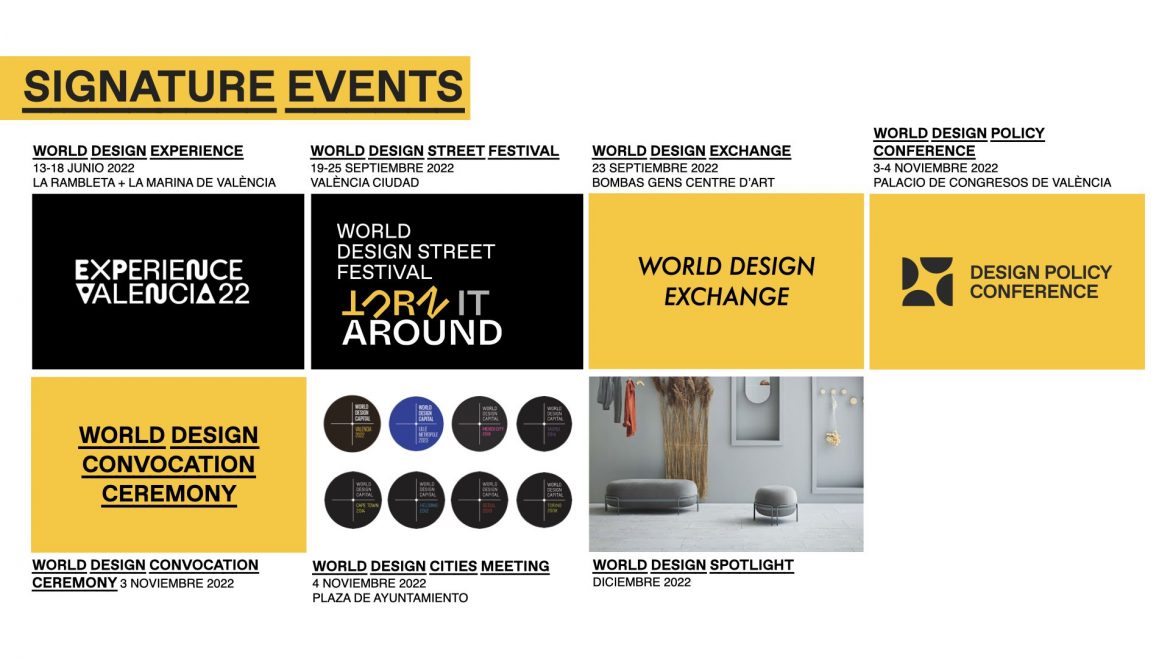 El 3 y 4 de noviembre de 2022, el Palacio de Congresos de Valencia será el escenario de la World Design Policy Conference, que contará con la involucración de primeras figuras como Ezio Manzini, Brandon Gien, Alok Nandi, Leyla Acoroglu, René Spitz, Anna Whicher, Päivi Tahkokallio, Gisele Raulik Murphy o Brigitte Borja de Mozota.