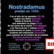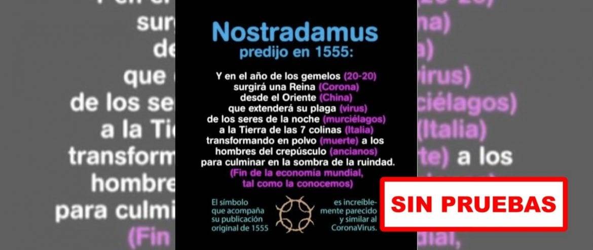 Nostradamus y el coronavirus. Más allá de la no evidencia científica de eso que llaman “predicciones”, ha vuelto a circular por redes sociales una imagen que dice que Nostradamus “predijo· en 1555 el coronavirus. En esta imagen se asegura que Nostradamus escribió un texto que decía: “en el año de los gemelos surgirá una reina desde el Oriente que extenderá su plaga de los seres de la noche a la Tierra de las 7 colinas transformando en polvo a los hombres del crepúsculo para culminar en la sombra de la ruindad”. No hay pruebas de que Nostradamus escribiera este texto.