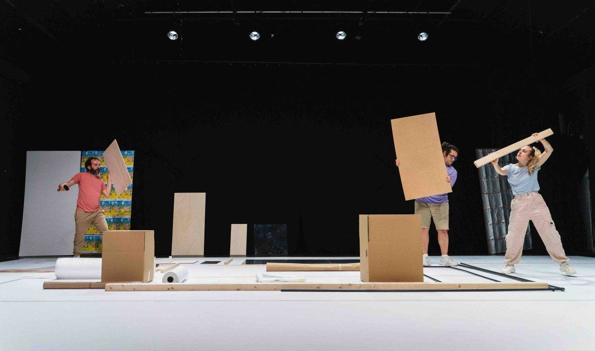 En la interpretación y colaboración creativa le acompañan Santiago Ribelles e Inka Romaní. El trío se sirve sobre el escenario de materiales normalmente pensados para ocupar un lugar auxiliar o de sujeción, como folios en blanco, planchas de madera, papel de pared, superficies de cartón, hilo, colores y luz.