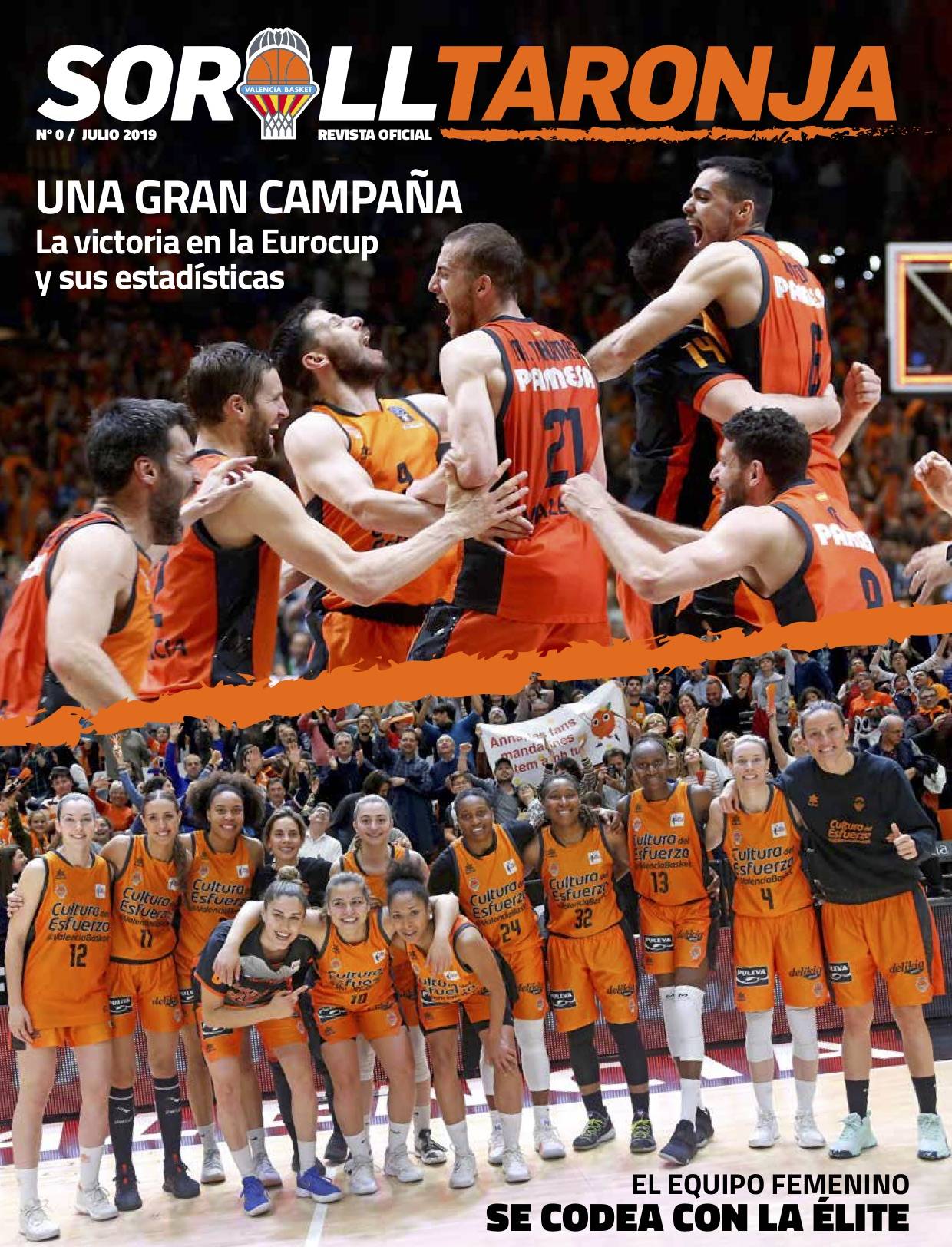 Los años 2017 y 2019 pasa­rán al recuer­do como dos hitos impor­tan­tes para la selec­ción y tam­bién para el Valen­cia Bas­ket, pues en este 2019 el club de la Fuen­te de San Luis ha con­se­gui­do su cuar­ta Euro­cup. Un tro­feo que, al igual que el res­to de efe­mé­ri­des de este ejer­ci­cio como la pri­me­ra tem­po­ra­da del equi­po feme­nino en la Liga Día o la con­so­li­da­ción de l’Al­que­ria del Bas­ket, han que­da­do refle­ja­dos en el núme­ro 0 de la revis­ta ofi­cial del Valen­cia Bas­ket, “Soroll Taron­ja”, edi­ta­da tam­bién por ELCA para el club.