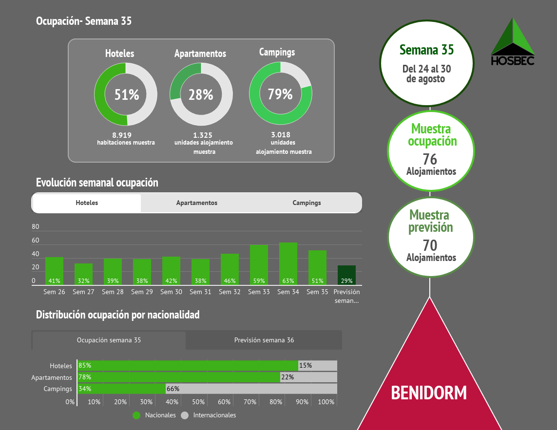 En la ciudad de Benidorm, el porcentaje de planta hotelera abierta fue del 65% (alrededor de 26.000 camas disponibles). Benidorm cierra la última semana de agosto con un 51% de ocupación en hoteles, un 28% en apartamentos turísticos y un 79% de ocupación en campings.