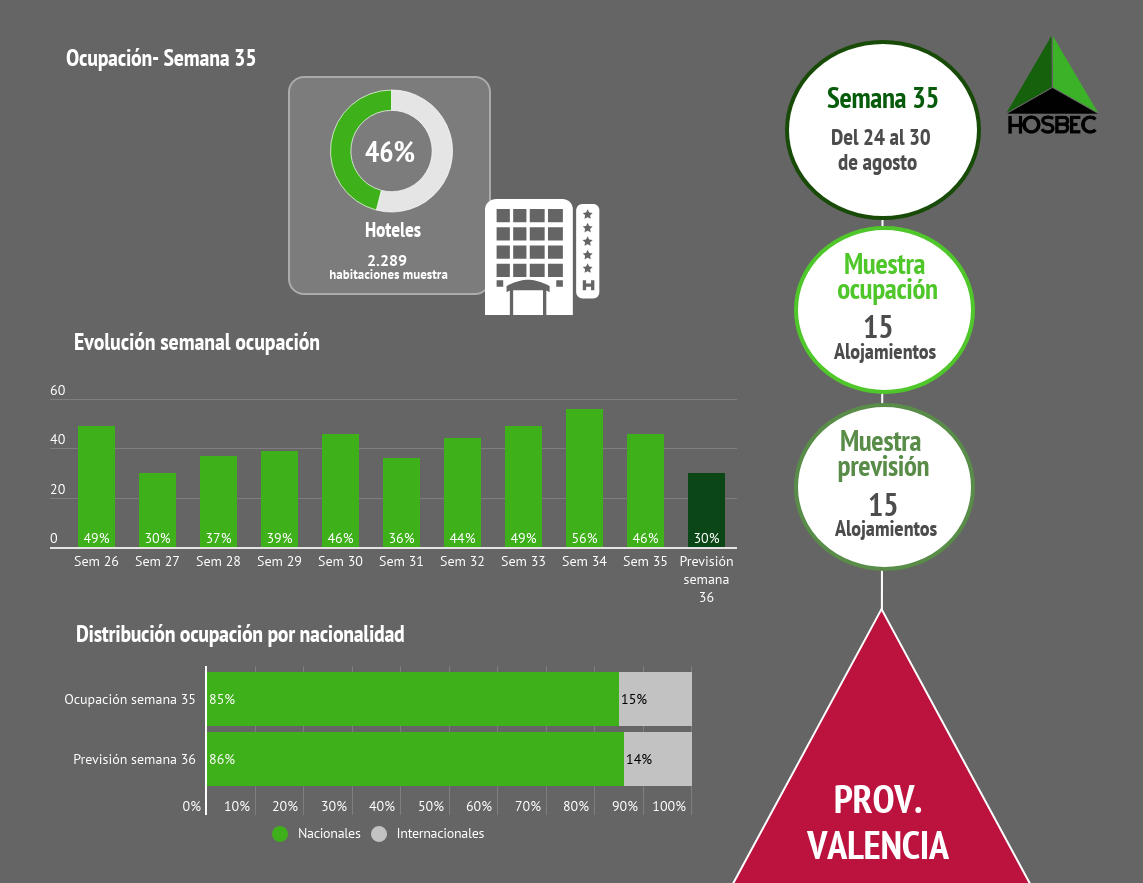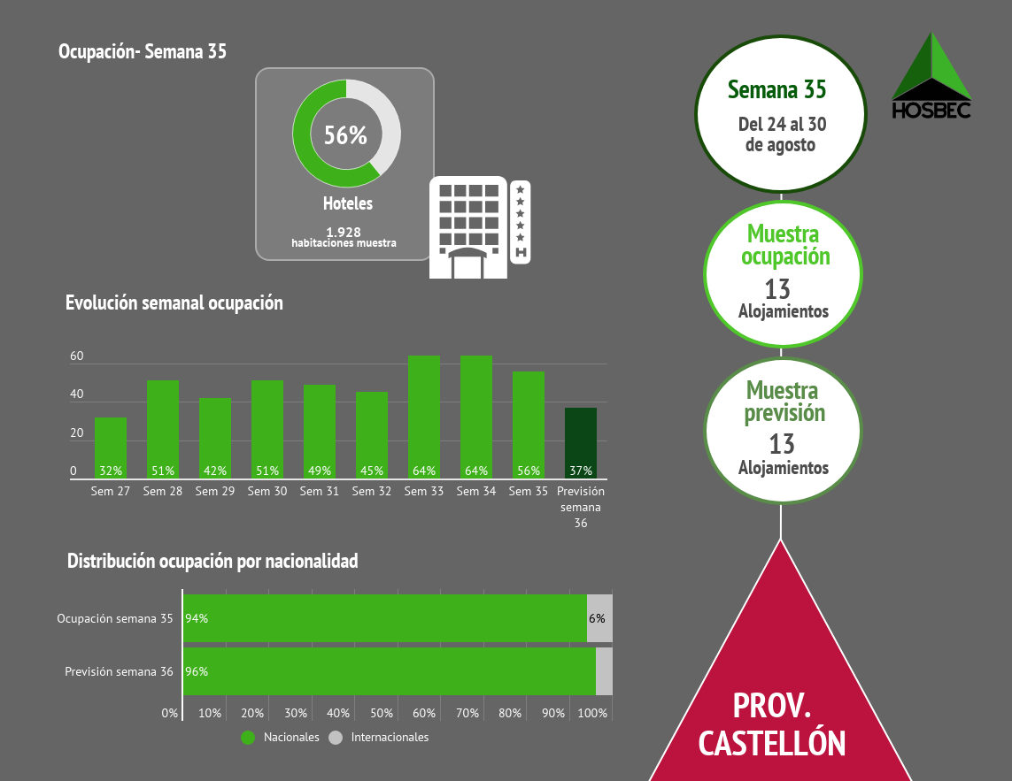En la provincia de Castellón, el porcentaje de planta hotelera abierta fue del 56% (alrededor de 13.000 camas disponibles). Registró un 56% de ocupación durante la semana 35. Aunque desciende respecto a las dos semanas anteriores que marcaban los máximos del verano, logra posicionarse con la segunda mejor ocupación mensual con un 57% de media. El mercado nacional mantiene su hegemonía con un 94%, mientras que sólo el 6% son turistas internacionales.