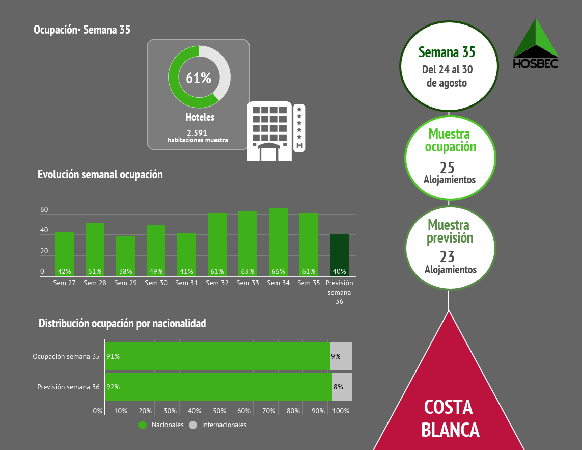 Los hoteles de la Costa Blanca volvieron a marcar, una semana más, el mejor registro en relación al resto de zonas con un 61% de ocupación media. Dato que cierra agosto con una media mensual del 63%. No obstante, a pesar de contar con dichos datos, la previsión de la semana 36 desciende a un 40%.