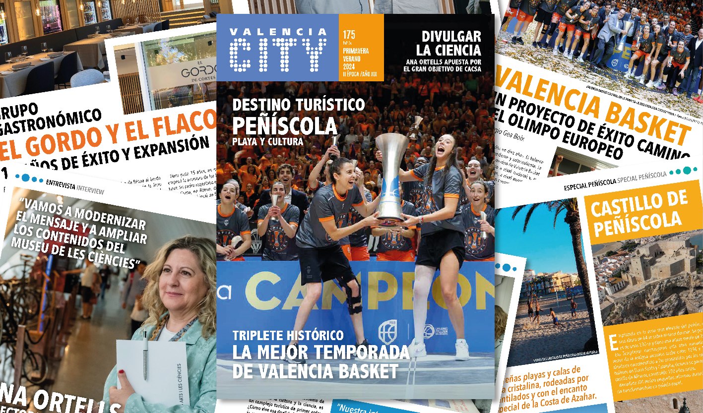 Inmersos en la primavera, y a las puertas del verano, ya está aquí el nuevo número de la revista Valencia City, la mejor guía de cultura, ocio, gastronomía y estilo de vida de la ciudad. El número 175 de la revista lleva a su portada el gran éxito del equipo femenino de Valencia Basket: un triplete histórico que catapulta al club, bajo el mecenazgo de Juan Roig, al olimpo nacional y europeo.