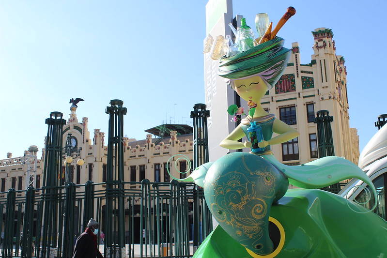 Els iglús verds servixen de base d’estes xicotetes falles, d’entre dos i quatre metres d’altura. La iniciativa forma part de la campanya “Recicla vidre amb esperit faller i cuida’t” que han posat en marxa Ecovidrio amb la col·laboració de la Generalitat i l’Ajuntament per animar a continuar reciclant vidre durant estes dates en què no s’han pogut celebrar les Falles a causa de la covid-19.