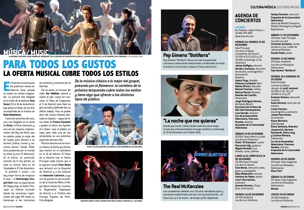 Por lo que respecta a las páginas de Cultura, en Valencia City hacemos un repaso de los conciertos más interesantes de los últimos meses. La lista incluye desde el rock más clásico, salpicado de ironía, de Elvez (el Elvis mexicano) a la soprano Chen Reiss, pasando por un homenaje a Carlos Gardel, el punk de The Real McKenzies, el folk con sabor valenciano de Pep El Butifarra o las increíbles voces de Mississippi Gospel Choir.