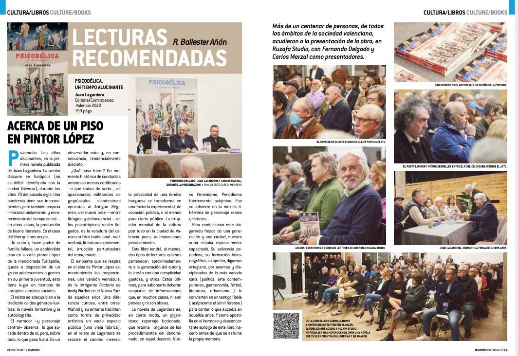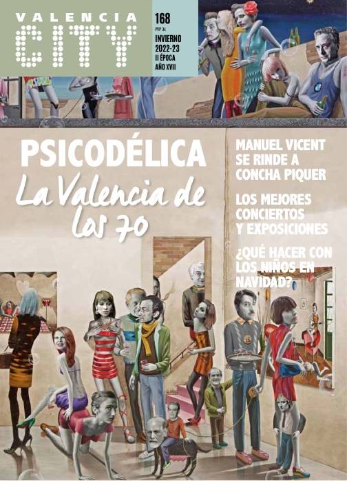 El último número Valencia City, el que hace el 168, la guía por excelencia de lo que hay que hacer en la ciudad, ya están en la calle. La portada de esta nueva entrega, que cubre hasta mediados del próximo mes de abril, está dedicada a Psicodélica. Un tiempo alucinante, la primera novela de Juan Lagardera. El relato nos traslada hasta a la ficticia (pero fácilmente reconocible) ciudad de Turiápolis, a mediados de los 70 del siglo pasado. Allí, grupos de jóvenes que rondaban los veinte años vivieron experiencias de cariz transformador en todos los órdenes de la vida: las relaciones personales, el sexo, la música y el resto de las artes, sobre todo las plásticas, el cine, la manera de vestirse y peinarse, sus lecturas, la política y unos nuevos estados de conciencia mediados por las drogas para vivir más allá de lo percibido hasta entonces.