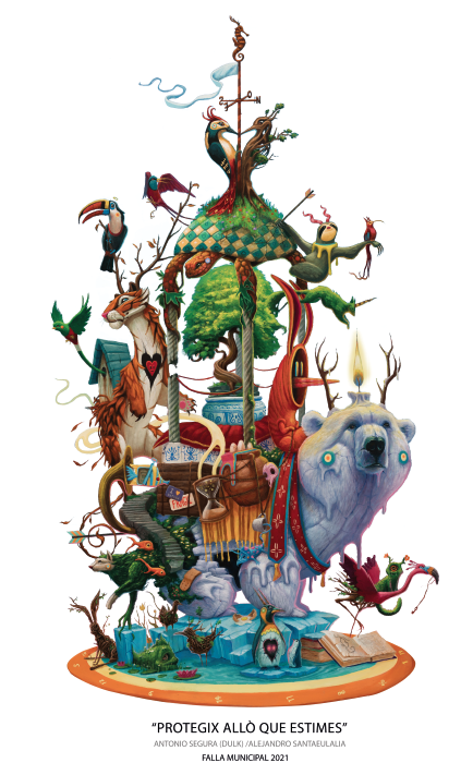El artista fallero Alejandro Santaeulalia y Antonio Segura (Dulk), uno de los artistas urbanos con más proyección en todo el mundo, son los creadores de la falla municipal de 2022. Bajo el lema “Protegeix allò que estimes”, este proyecto pone de relieve que “somos la única especie que destruimos nuestra casa” y esta falla “aúna el interés por la naturaleza y la preocupación por la conservación de las especies, construyendo un mundo con mucha realidad pero también con mucha magia”. A nivel estético destaca el estallido de color de la falla y el hecho de que todo lo que pasa a la obra tiene una relación.