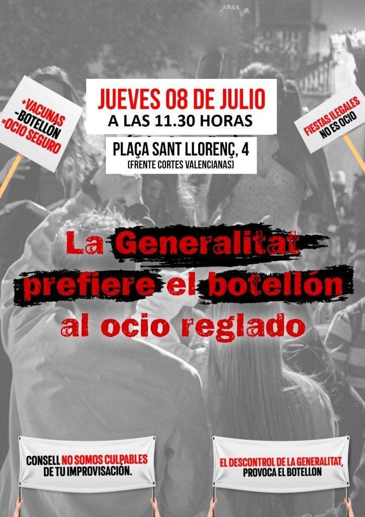 El acto, con­vo­ca­do por la Coor­di­na­do­ra Empre­sa­rial de Ocio y Hos­te­le­ría de la Comu­ni­dad Valen­cia­na ( CEOH) y que pre­ten­de reu­nir a todos los empre­sa­rios y tra­ba­ja­do­res del sec­tor, con­sis­ti­rá en la esce­ni­fi­ca­ción de un bote­llón sim­bó­li­co en la vía públi­ca para visi­bi­li­zar el ries­go que con­lle­va el ocio no regla­do, que ha sido y está sien­do el pro­ta­go­nis­ta en pla­zas, pla­yas, calles de toda la Comu­ni­tat, jun­to con otro tipo de acti­vi­da­des recrea­ti­vas des­con­tro­la­das en la vía públi­ca, en espa­cios clan­des­ti­nos o fies­tas pri­va­das, fren­te a los esta­ble­ci­mien­tos adap­ta­dos y pre­pa­ra­dos para que el ries­go de con­ta­gio sea el míni­mo posi­ble con todos los pro­to­co­los de con­trol acti­va­dos.