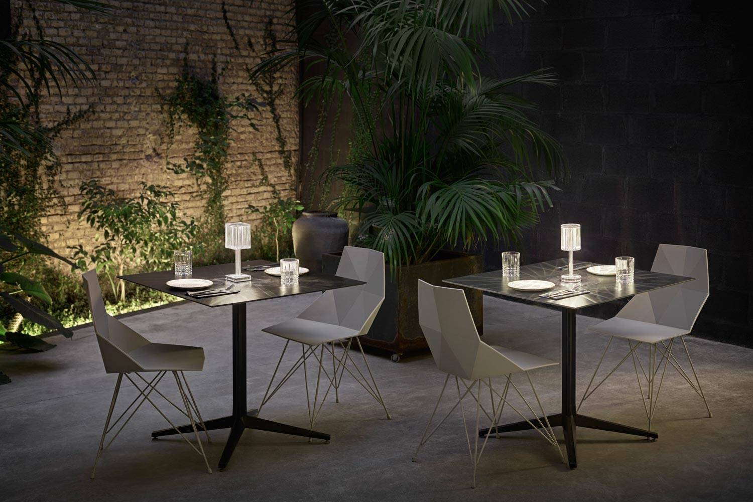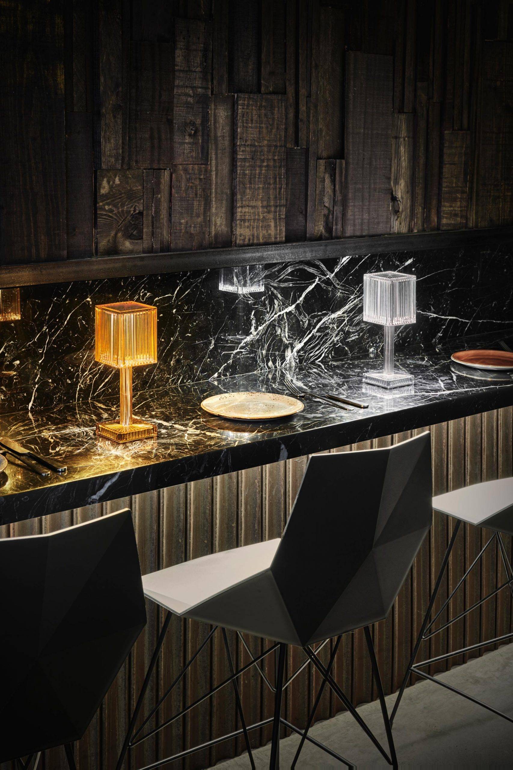 La colección Gatsby, diseñada por Ramón Esteve para VONDOM, es una reminiscencia a la iluminación del Art Déco. La lámpara nace de la idea de crear una envolvente a través de un juego de luces sugerente que se consigue mediante las superficies de la pieza, donde el policarbonato reproduce la forma y las sensaciones del vidrio grabado.