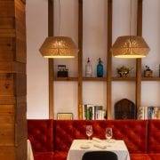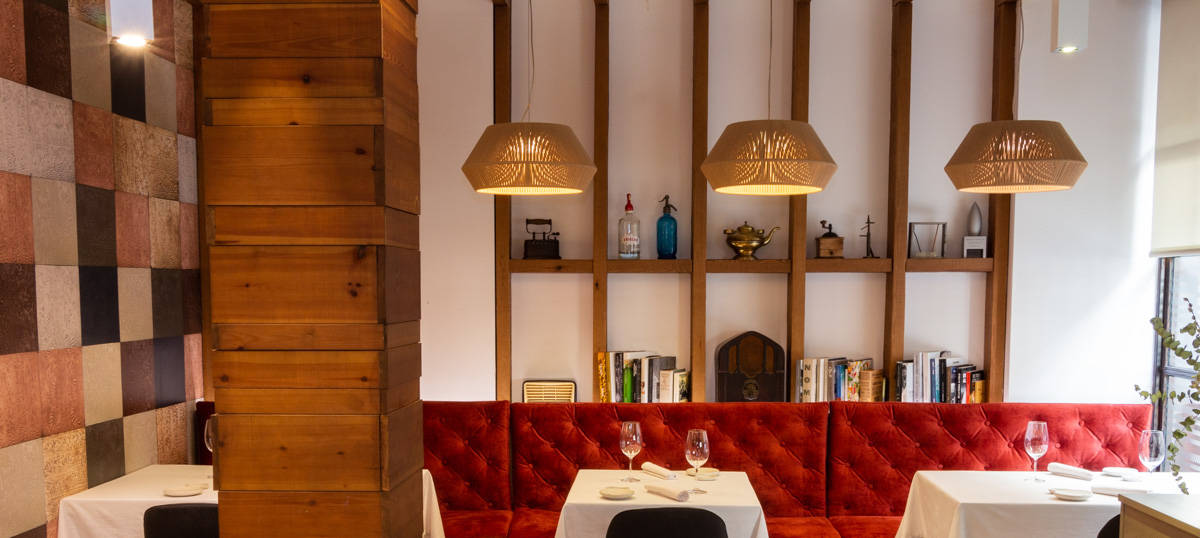 La renovación de las instalaciones ha logrado una atmósfera más sofisticada, gracias al revestimiento de la pared en tonos ocres o a la tapicería de terciopelo de los sofás, que hacen sentir al cliente en un espacio cálido y acogedor. También se ha reducido el número de mesas, de diez a siete, para ganar en amplitud y primar la comodidad. Por su parte, el vestíbulo incorpora un revestimiento metalizado y mantiene la fotografía de Mikel Ponce, que habla de huerta, de producto, de raíces.