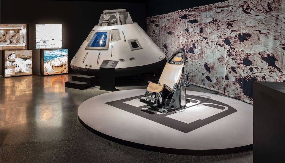 Entre las piezas que pueden verse destacadas destacan la reproducción de la sección de mandos del módulo lunar a tamaño real —tan pequeña que Armstrong tuvo que dormir sobre el motor y Aldrin, en el suelo— y del claustrofóbico centro de mandos (que Collins no abandonó en ningún momento durante los casi seis días que duró el viaje); una réplica del ordenador de a bordo, el AGC (Apollo Guidance Computer), que hizo posible la proeza pese a tener menos capacidad de procesamiento que un viejo Nokia; los alimentos utilizados en viajes espaciales, así como diferentes objetos reales y productos de higiene y de primera necesidad.