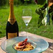 Una botella de Krug Grande Cuvèen 170ª Édition junto a la arroz con gamba que se sirvió en la comida en Maison Krug.