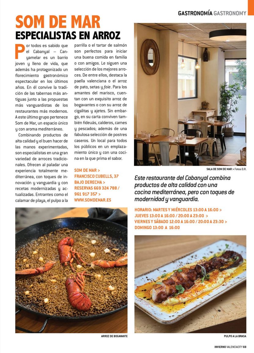 Por todos es sabido que el Cabanyal – Canyamelar es un barrio joven y lleno de vida, que además ha protagonizado un florecimiento gastronómico espectacular en los últimos años. En él convive la tradición de las tabernas más antiguas junto a las propuestas más vanguardistas de los restaurantes más modernos. A este último grupo pertenece Som de Mar, un espacio único y con aroma mediterráneo.