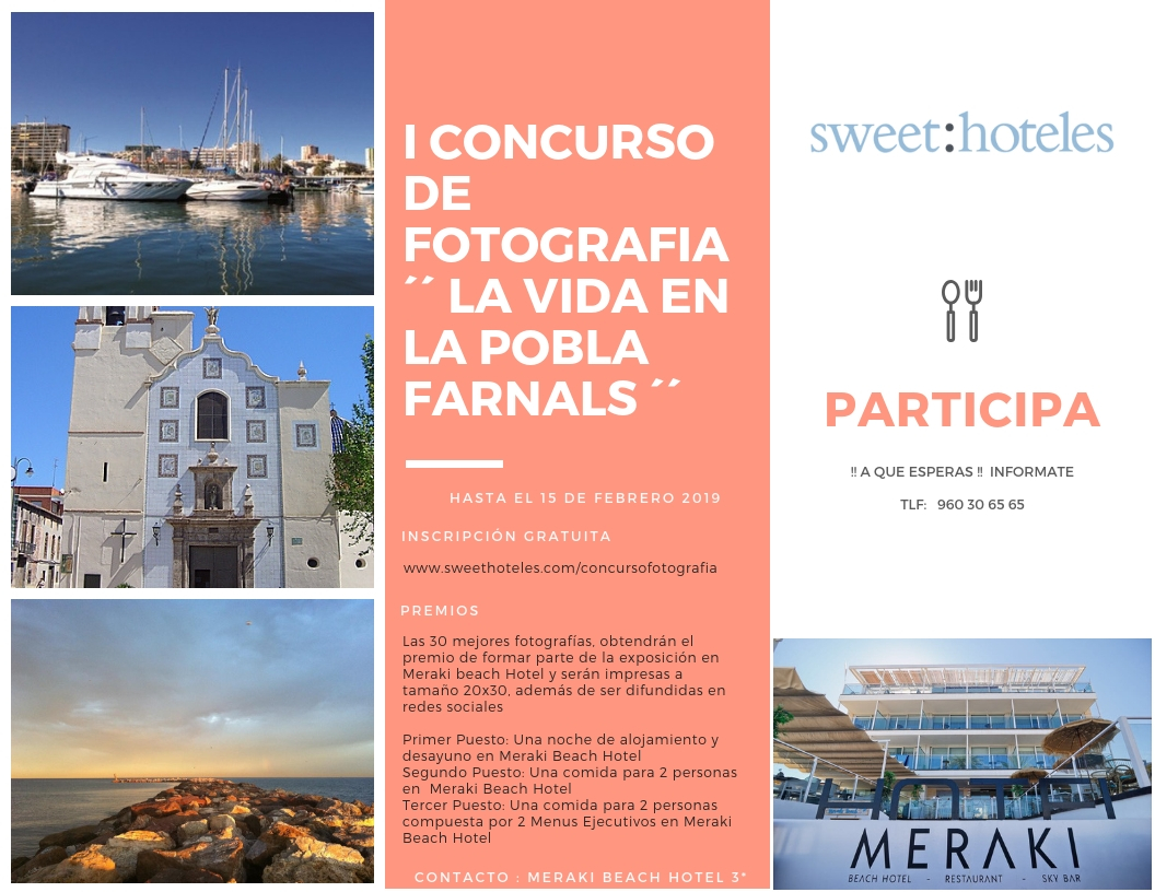 Con el tema “La Vida en la Pobla de Farnals”, Sweet Hoteles, dada su vinculación al municipio a través de Meraki Beach, quiere promover el conocimiento y la divulgación de la belleza y el interés turístico y cultural de la Pobla, con el apoyo del consistorio. Cultura, pensamiento, arte, solidaridad, desarrollo social y protección del medio ambiente, son los principios de esta convocatoria, que se verán reflejados en todos y cada uno de los puntos de vista de los participantes.