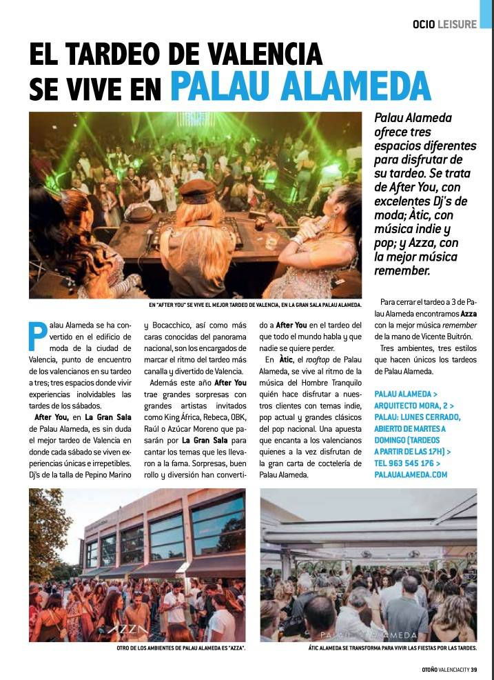 After You, en La Gran Sala de Palau Alameda, es sin duda el mejor tardeo de Valencia en donde cada sábado se viven experiencias únicas e irrepetibles. Dj’s de la talla de Pepino Marino y Bocacchico, así como más caras conocidas del panorama nacional, son los encargados de marcar el ritmo del tardeo más canalla y divertido de València.