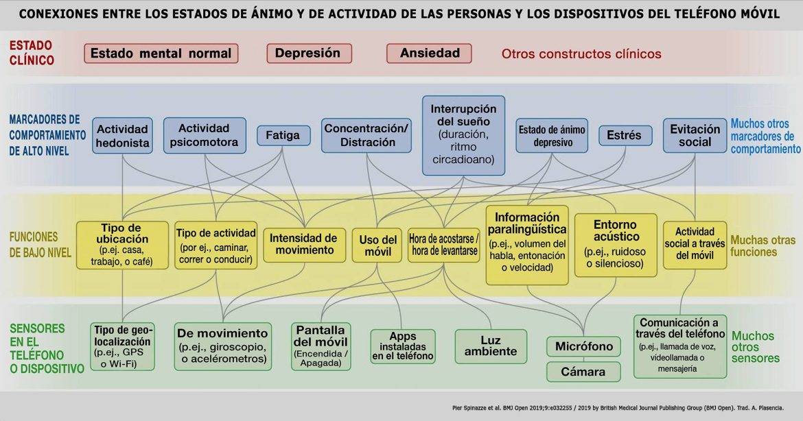Por ello, diversos científicos de medicina están empezando a usar para sus investigaciones de salud mental las propias capacidades de los dispositivos para medir las alteraciones que produce en muchas personas su compulsivo, pero también para ayudarse de estas tecnologías tan sofisticadas para prevenir y paliar algunas enfermedades de salud mental en enfermos que sufren mucho con ellas. Voy a exponer algunos avances de investigadores de la salud en los que están usando las propias prestaciones en relación a los datos —algunas insospechadas para la mayoría—, de estas máquinas digitales que todo el mundo llevamos hoy consigo.
