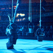 Aigua, de la com­pa­ñía villa­rrea­len­se Nuc, es poe­sía visual sobre la soli­da­ri­dad, el medio ambien­te y la amis­tad. Una refle­xión a 10 metros de altu­ra, con zan­cos, dan­za aérea y acro­ba­cias. Una metá­fo­ra de nues­tro paso por el pla­ne­ta.