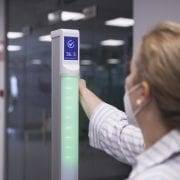 El sistema incluye un sensor para medición de temperatura corporal sin contacto, con un dispositivo infrarrojo integrado. Se puede situar en diferentes alturas para facilitar la lectura de personas de todas las estaturas, niños y personas con movilidad reducida.