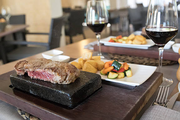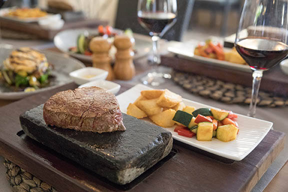 Bacchus ofrece vaca rubia gallega, ciervo y canguro de alta calidad a la piedra y con buenos acompañamientos como fondues y ratatuilles.