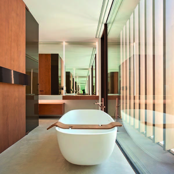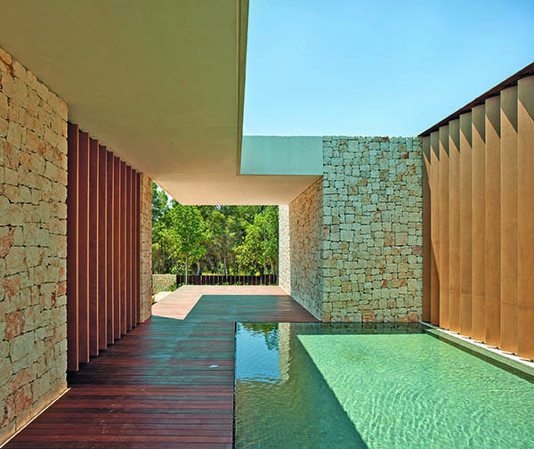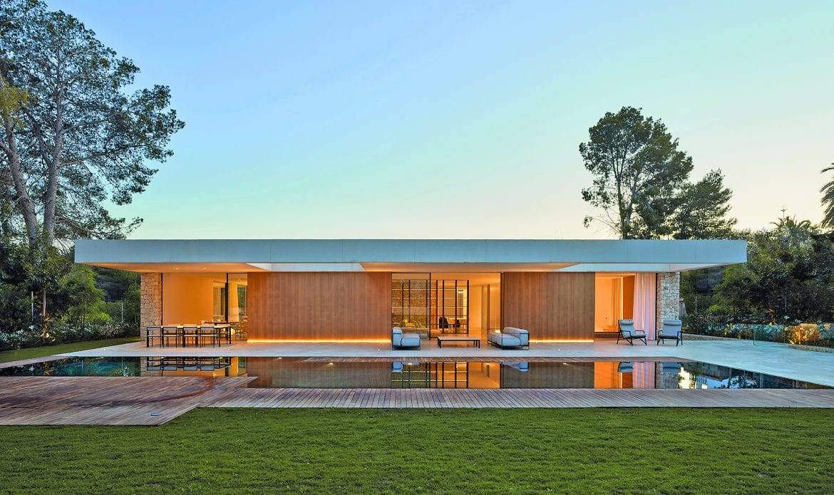 Tanto la lámina de agua de la entrada como la piscina longitudinal crean un efecto de agrandamiento del espacio a la vez que refrescan la atmósfera. Cada elemento, desde la arquitectura que define el proyecto hasta el último detalle, respira la misma filosofía y tiene el mismo lenguaje. Todo el mobiliario de la vivienda está diseñado por Ramón Esteve Estudio, entre otros los últimos que ha producido la prestigiosa firma italiana Talenti, que ha incorporado al arquitecto valenciano entre sus diseñadores de mobiliario exterior.
