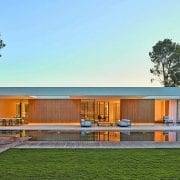 Tanto la lámina de agua de la entrada como la piscina longitudinal crean un efecto de agrandamiento del espacio a la vez que refrescan la atmósfera. Cada elemento, desde la arquitectura que define el proyecto hasta el último detalle, respira la misma filosofía y tiene el mismo lenguaje. Todo el mobiliario de la vivienda está diseñado por Ramón Esteve Estudio, entre otros los últimos que ha producido la prestigiosa firma italiana Talenti, que ha incorporado al arquitecto valenciano entre sus diseñadores de mobiliario exterior.