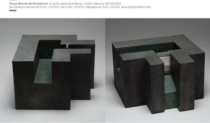 “Mestre traza formas geométricas abstraídas en un primer momento de lo que ve afuera, en la huerta que rodea al taller-castillo, pero una vez ensimismadas, retraídas, impelidas por la propia lógica de la escritura, pierden su referente sensible y pasan a ser invenciones imaginarias de un orden simbólico. La figura intuida, “elegida” al final de las variaciones, a la que nada le falta ni nada le sobra, objeto apropiado del deseo, es construida como cuerpo de barro para acoger de manera prorrogada el pensamiento que entre ahí. Las construcciones de Mestre son espacios arquitectónicos sobrios, minimalistas, con esa geometría desprovista de signos que invita a entrar virtualmente a cualquiera que haga el ritual de entornar la mirada, despojarse de lo banal, dislocarse por unos instantes. La selección cuidada de sus trabajos en la galería Set Espai hacen de este espacio una fractura, una incisión, una epoché o suspensión momentánea del ruido en nuestro deambular por las calles. La casa-taller-texto-castillo estaba destinada a ser rodeada finalmente por la ciudad”. Extracto del texto Los trabajos y los días de Enric Mestre. Una escritura de la trascendencia de Teresa Calbo, comisaria de la muestra.