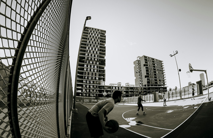 “Es un escenario normalizado, donde la vida sigue y donde la anomalía se convierte en paisaje cotidiano. El movimiento de los jugadores, en un encuadre sorprende, captura la atención del observador; el fondo es sólo un marco, un espacio cualquiera. El fotógrafo nos sugiere de esta manera que el edificio, sus ventanas vacías, sólo son objetos inermes que forman parte del paisaje urbano”.