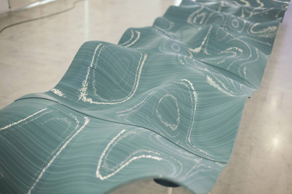 Al acce­der al espa­cio, estruc­tu­ra­do en tres zonas, el visi­tan­te es reci­bi­do por una pie­za de gran­des dimen­sio­nes que evo­ca el mar, una ola de sie­te metros de lon­gi­tud. Fabri­ca­da con impre­sión 3D con un bra­zo robó­ti­co en los talle­res de Naga­mi, a par­tir del dise­ño de Serrano y Basel­ga. La ola está rea­li­za­da de PETG 70% reci­cla­do y 100% reci­cla­ble.