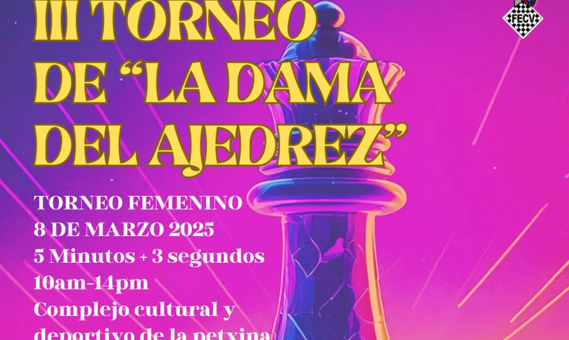 Valencia celebrará la tercera edición del Torneo La Dama del Ajedrez este 8 de marzo de 2025, coincidiendo con el Día Internacional de la Mujer. Este evento forma parte de las celebraciones del 550 aniversario de Valencia como cuna del ajedrez moderno.