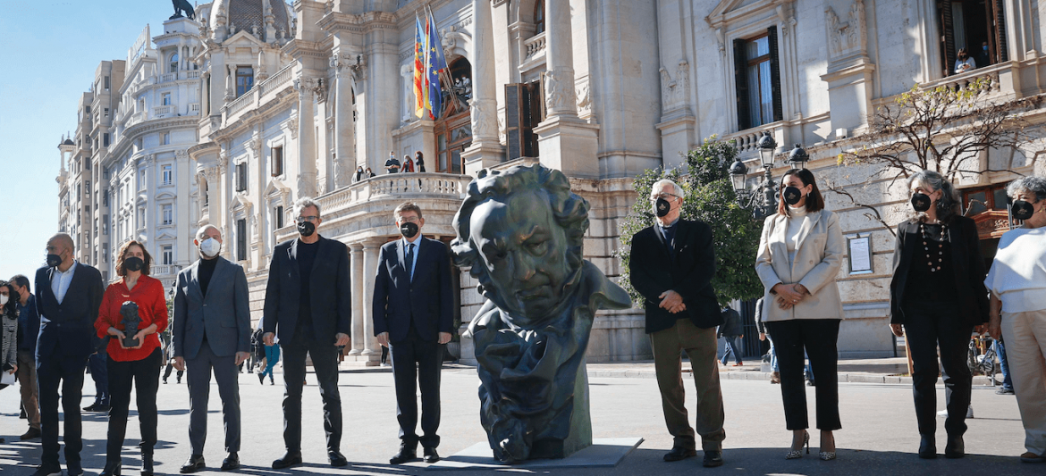 “Nuestro escultor más excelente, nacido en el barrio de Carmen y que, como Berlanga, siempre mantuvo su vínculo y amor por Valencia, realizó el busto a partir del cual se han realizado las estatuillas de los galardones del cine español”, ha resaltado la máxima autoridad municipal, quien así mismo ha aprovechado para dar las gracias a la familia Benlliure y a la Fundación que lleva el nombre del artista, “para conservar la escultura, y cederla de manera altruista porque el arte de Mariano Benlliure continúa estando de actualidad”. Ahora, con motivo de la Gala de los Goya, el Ayuntamiento ha instalado 12 réplicas gigantes de la estatuilla de los Premios Goya por todos los barrios para visibilizar que la ciudad es la sede de la mencionada fiesta del cine español.