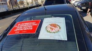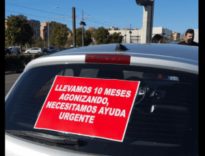 Uno de los carteles de protesta pegado en un vehículo participante. Foto: Zulema Alcaraz.