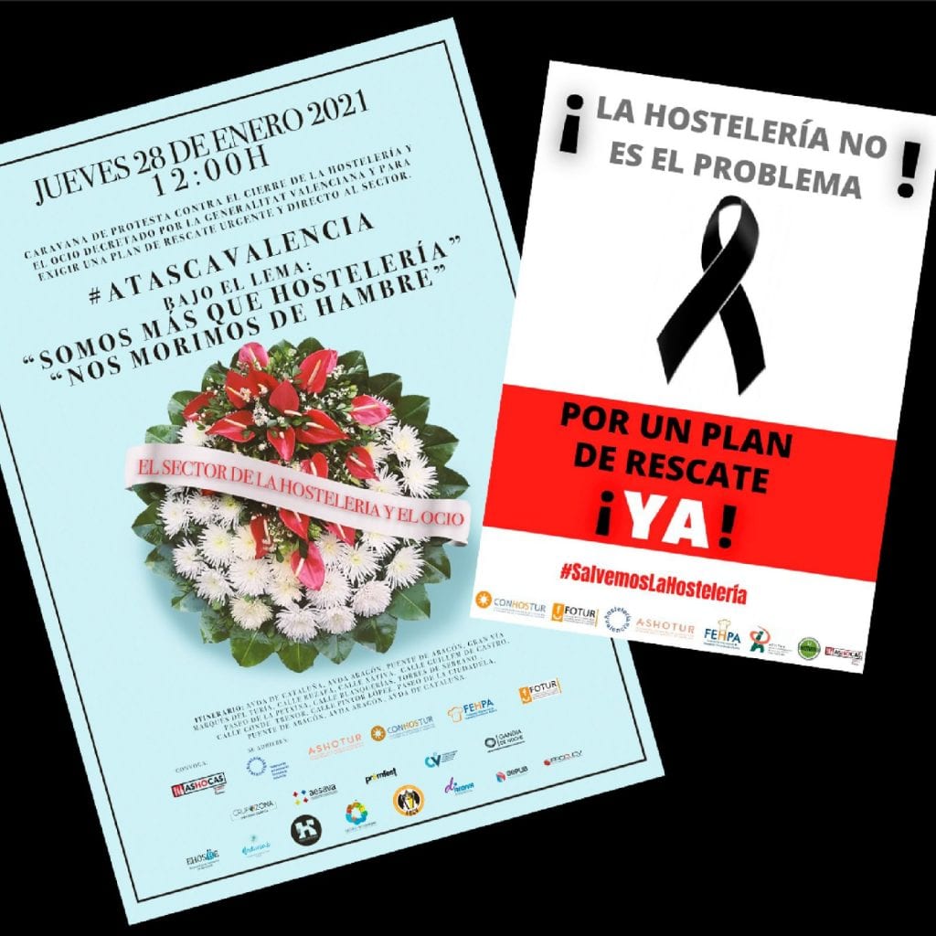 Por su parte, Conhostur empezó su acto central a las 11:30 horas en la plaza de la Virgen, donde leyeron un manifiesto y depositaron, junto al resto de convocantes, una corona de flores por la “muerte” de la hostelería y el ocio valencianos.