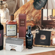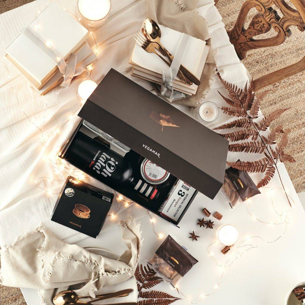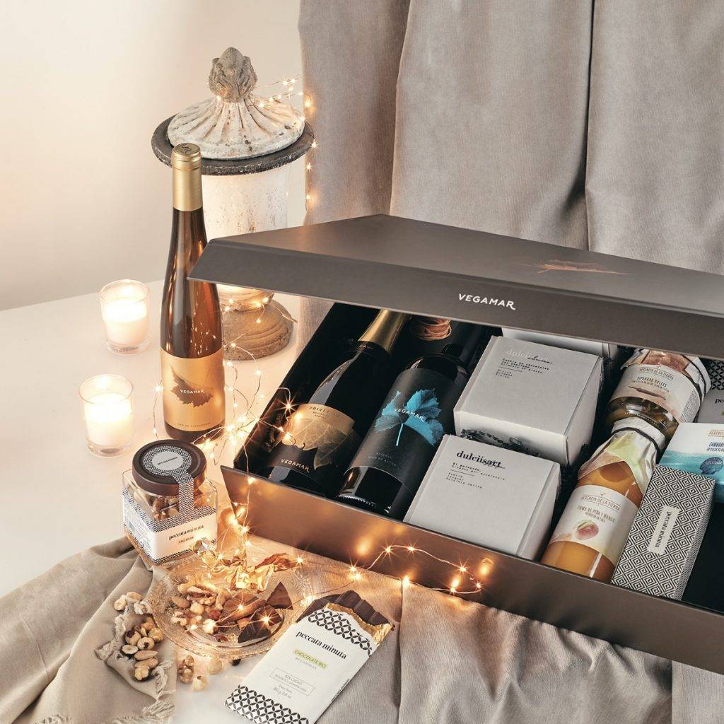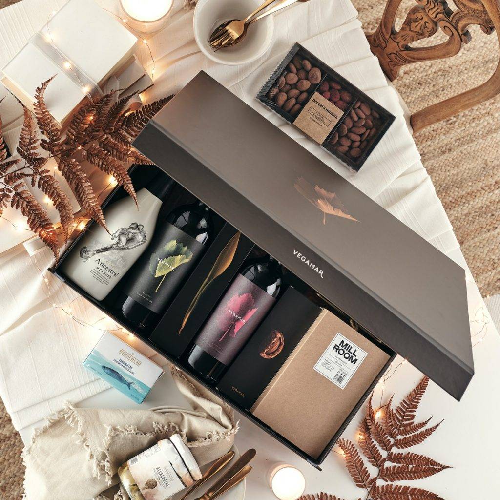 Packs con vermut ¡Oh la lá!, cava Vegamar Privée, Ancestral blanco y rosado, vino blanco Huella de Merseguera, Huella de Verdejo, o vino tinto Huella de Cabernet Sauvignon. Combinado con ibéricos como el jamón 100% ibérico de bellota o el lomo ibérico, con queso curado de Oveja y de Trufa, y conservas Herencia del Mar, como las zamburiñas en salsa de vieira o los mejillones en Escabeche de las Rías Gallegas, y las de Herencia de la Tierra, como los espárragos o los corazones de alcachofa. Así como las cremas de espárragos y mango.