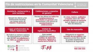 Puig también ha explicado que decaen los límites de aforo en todos los establecimientos y actividades en general, así como en eventos y celebraciones, salvo que el evento se celebre con público de pie, en cuyo caso el aforo se restringirá a razón de 2,25 metros cuadrados por persona.
