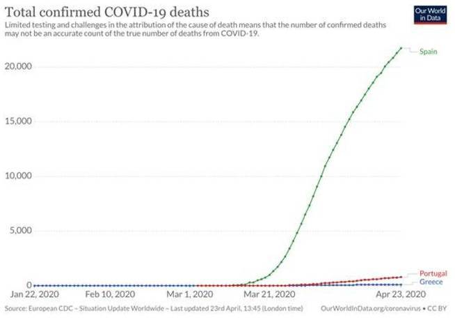 En suma, ambos países tomaron medidas a la vez —aunque algo más laxas— que España… Pero las tomaron partiendo de un menor número de contagios: es decir, actuaron más tempranamente en términos de extensión de la epidemia. Tal anticipación ha resultado ser crucial: a fecha de hoy, el número de fallecidos en España a causa del covid-19 supera los 22.000; en cambio, en Portugal totaliza 820 y en Grecia, 121 (es verdad que ambos países están menos poblados que España: pero España sufre casi 24 veces más muertos que los dos países en conjunto con solo 2,2 veces más habitantes).