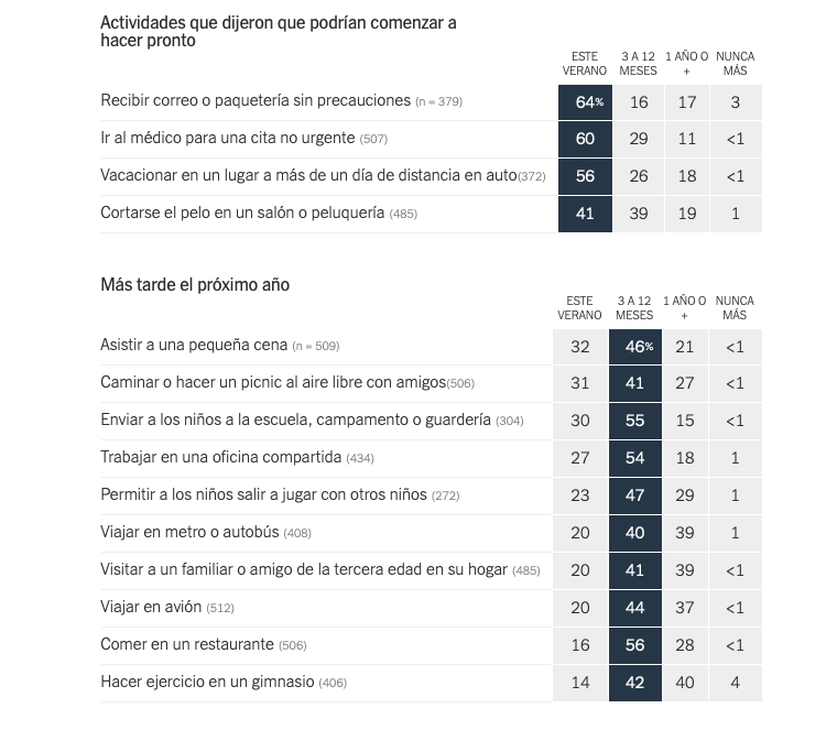 Algunos dijeron que los salones de belleza y las peluquerías eran lugares relativamente seguros ―no suelen estar abarrotados y siguen normas de higiene―, mientras que otros dijeron que un corte de pelo implica un alto riesgo debido al contacto tan cercano. Un 41 por ciento de los participantes iría a este tipo de establecimiento ahora o este verano, pero el 19 por ciento planea esperar al menos un año. Una tercera parte dijo que asistirá a una cena en la casa de algún amigo este verano (muchos especificaron que sería al aire libre y con un distanciamiento apropiado), en tanto que una quinta parte dijo que esperaría más de un año, posiblemente hasta que hubiera una vacuna.