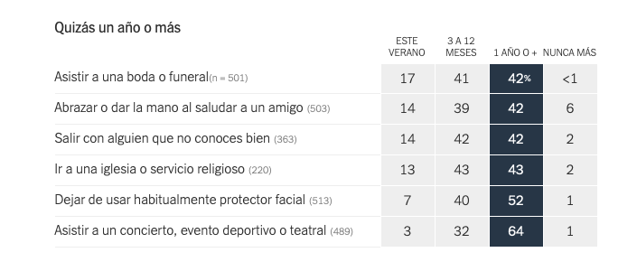 Una cosa en la que los epidemiólogos parecían estar de acuerdo era en que, incluso cuando volvieran a sus actividades normales, las harían de forma diferente durante mucho tiempo, como socializar con amigos en espacios abiertos o asistir a servicios de culto en línea. La mayoría dijo que pasará más de un año antes de que dejen de usar mascarillas fuera de casa.