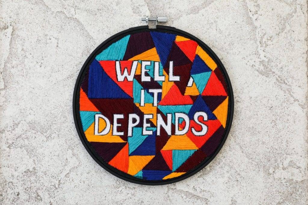 Dijo que uno de sus pasatiempos en la cuarentena ha sido el bordado inspirado en la epidemiología: “Este dice: ‘Bueno… depende’, porque ese es realmente nuestro lema”.