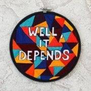Dijo que uno de sus pasatiempos en la cuarentena ha sido el bordado inspirado en la epidemiología: “Este dice: ‘Bueno… depende’, porque ese es realmente nuestro lema”.