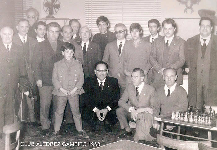 Foto de grupo del Gambito con Ferrandis, que entonces tenía 43 años. Es el hombre fornido, en el grupo de la izquierda, de pie, tiene ante él a su hijo pequeño. También se encuentra Navarro, joven, con las manos en los bolsillos. Y Rafa Marí, en el medio, justo detrás del todo.