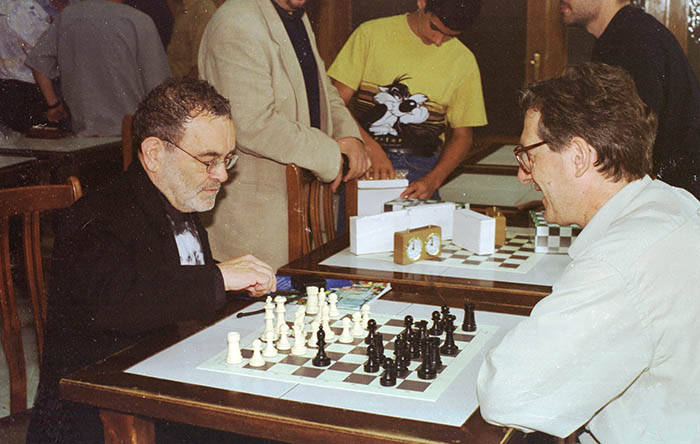 No fue esa la última placa de homenaje entregada por el Gambito. El pasado 11 de septiembre le tocó el turno al profesor Ramón Navarro (Valencia, 1953), también citado por Arrabal, y figura esencial de la historia del club y en mi opinión un jugador con una clase extraordinaria, claramente superior, desde su amateurismo, a la de muchos profesionales del tablero. Yo le llamo “el Karpov valenciano”, por sus similitudes de estilo. Convencí a Ramón para que viniera a comer conmigo en Las Brasas de Mislata, con la débil excusa de comentarle algunos aspectos sobre temas que no le aclaré. Se tragó el anzuelo. Cuando llegó al restaurante le esperábamos veinte jugadores del Gambito. Todos, puestos en pie, le recibimos con un largo aplauso. Antes de empezar a comer, le entregamos una placa que decía: “A Ramón Navarro, con el reconocimiento y el afecto de los jugadores del Gambito. Te queremos”. ¿Demasiado dulzón? No: palabras justas en cuyo interior hay muchas micro-historias de agradables viajes y emocionantes victorias.